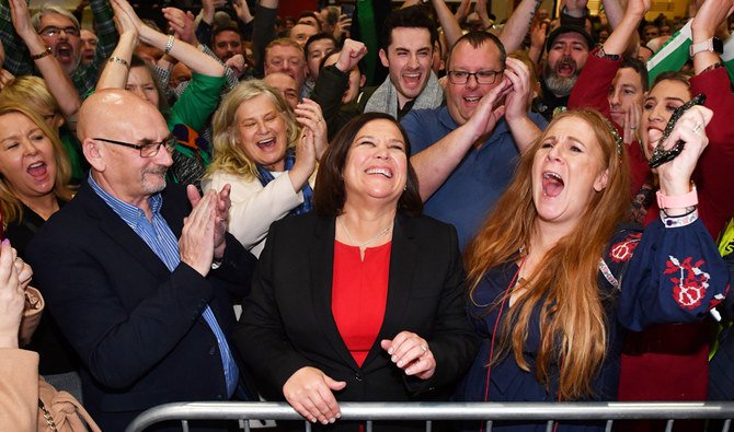 Sinn Féin party leader Mary Lou McDonald (center) celebrates with her supporters after populist revolution sweeping globe slams into Ireland on 8 February 2020, whatdoesitmean.com