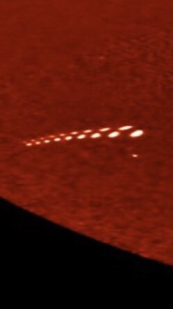 ***There’s a LARGE UFO protruding out of the top of the sun. It started on the west side and then 4 hours later, it appeared at the top of the sun. They remind me of the Phoenix Lights the way that they are attached together.