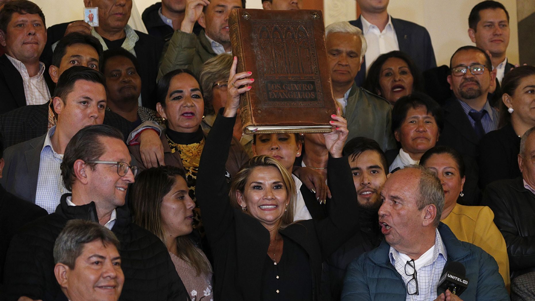 …after which Bolivian interim president Jeanine Añez (center holding Bible over her head) declares to world: “God has allowed the Bible to come back into the palace. May He bless us”. whatdoesitmean.com